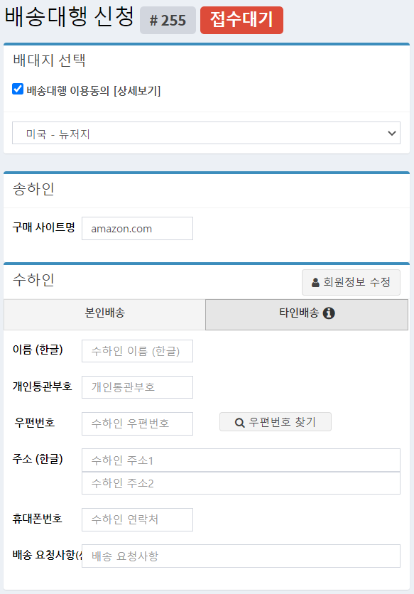 배송대행 신청서 "수하인" 부분에서 "타인배송"을 선택 한후 수하인 정보를 입력하세요