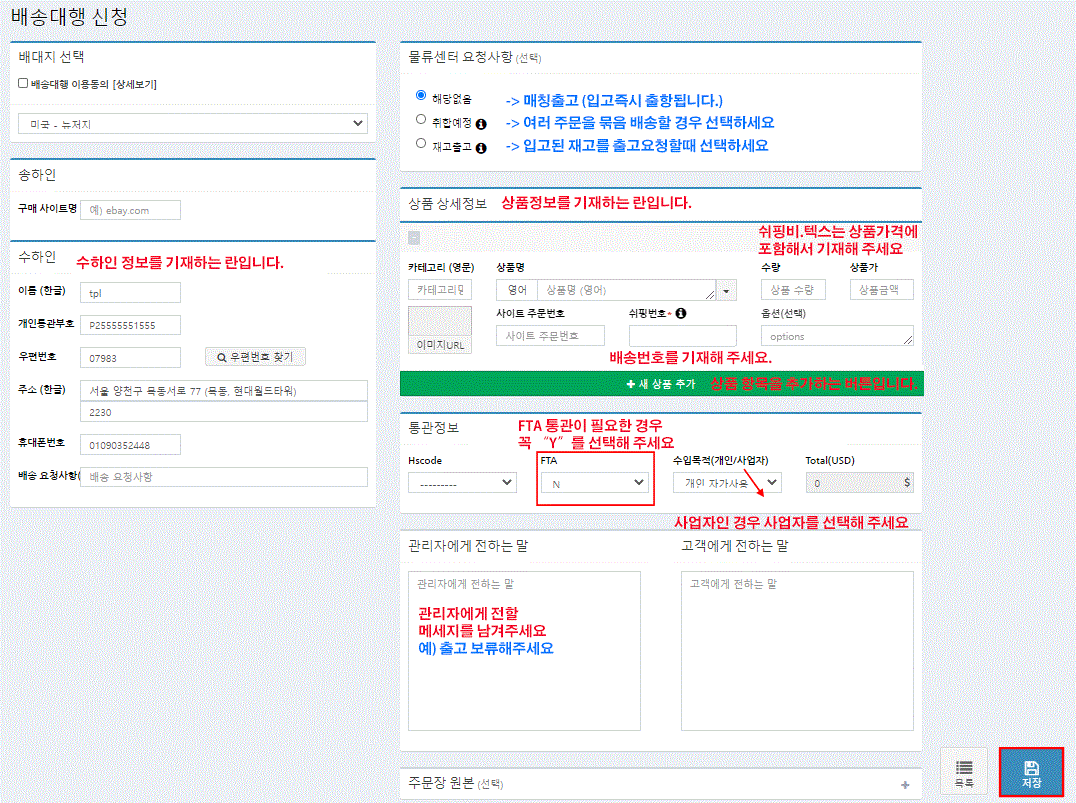 * 기존 글로 출고요청 : 이전에 배송대행 신청하신 기존 글을 찾으신 후 저장 버튼을 누르시어 출고 요청해 주세요.